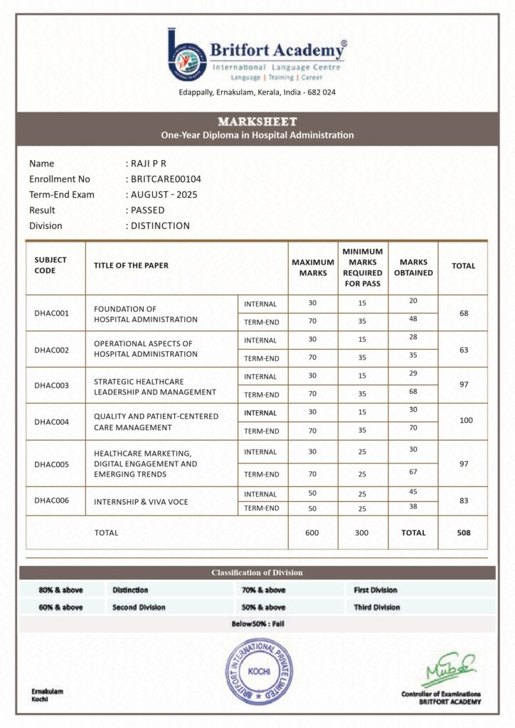 Verified Issued by: Britfort AcademyIssued on: 02/07/2024Issued to: Raji PRRegister number: BRITCARE00104