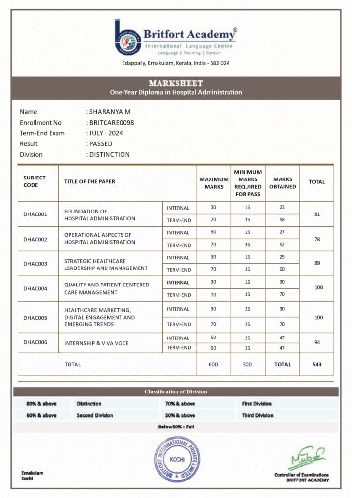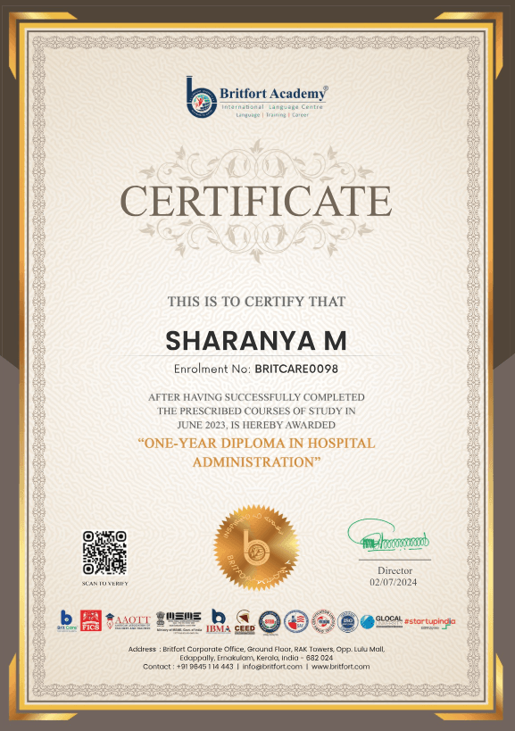 Verified Issued by: Britfort AcademyIssued on: 02/07/2024Issued to: Sharanya MRegister number: BRITCARE0098