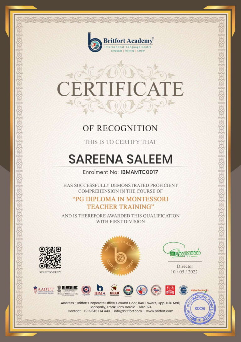 Verified ✅Issued by: Britfort AcademyIssued on: 10/05/2022Issued to: Sareena SalimRegister number: IBMAMTC0017