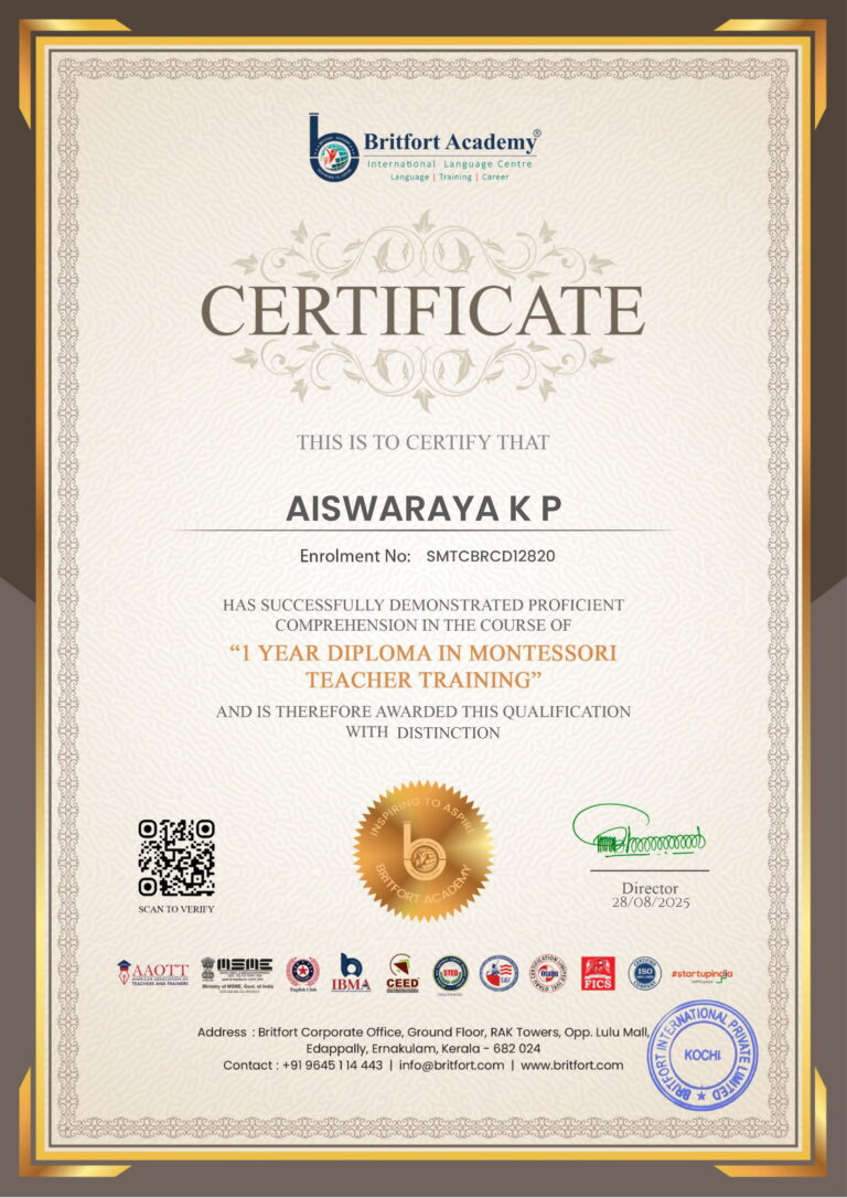 Verified ✅Issued by: Britfort AcademyIssued on: 28/08/2025Issued to: Aiswarya K PRegister number: SMTCBRCD12820