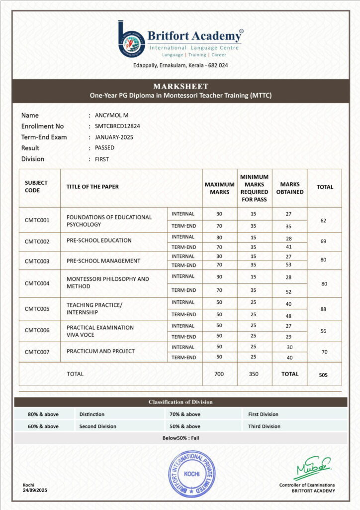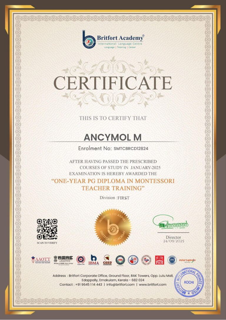Verified ✅Issued by: Britfort AcademyIssued on: 24/09/2024Issued to: Ancymol MRegister number: SMTCBRCD12824