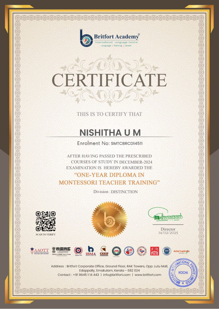 Verified ✅Issued by: Britfort AcademyIssued on: 14/02/2025Issued to: Nishitha U M Register number: SMTCBRCD14511