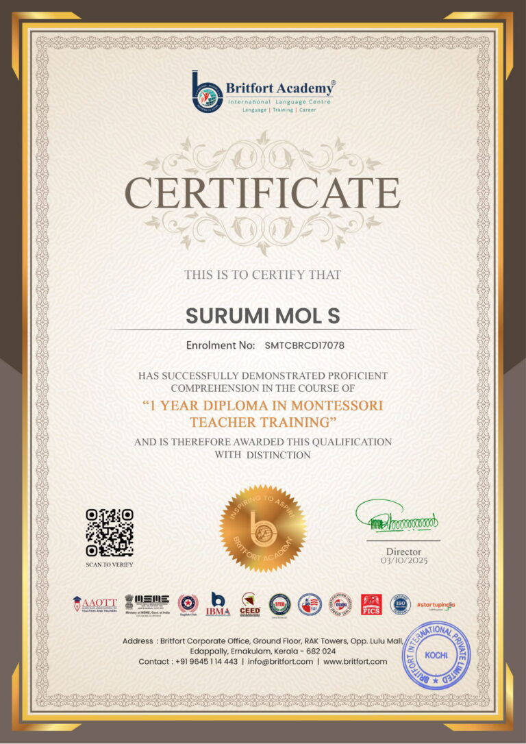 Verified ✅Issued by: Britfort AcademyIssued on: 03/10/2025Issued to: Surumi Mol S Register number: SMTCBRCD17078