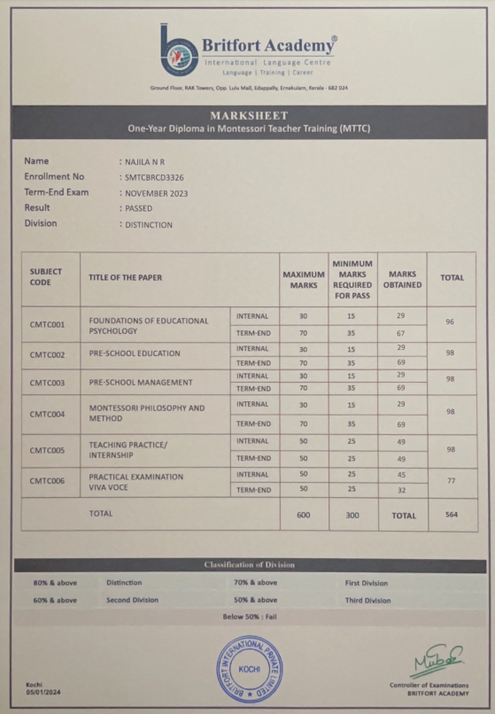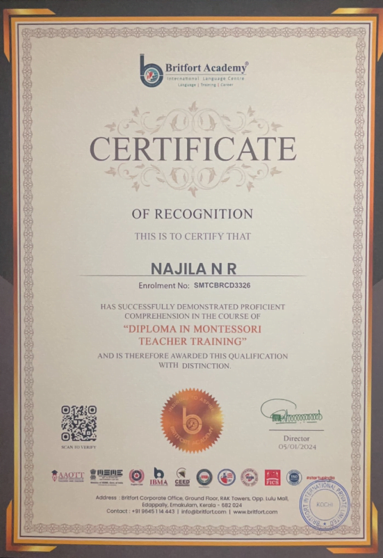 Verified ✅Issued by: Britfort AcademyIssued on: 05/01/2024Issued to: Najila NRRegister number: SMTCBRCD3326