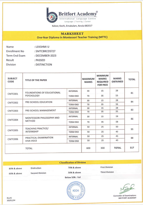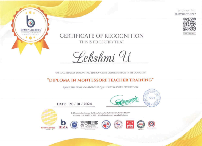 Verified ✅Issued by: Britfort AcademyIssued on: 20/01/2024Issued to: Lekshmi URegister number: SMTCBRCD5727