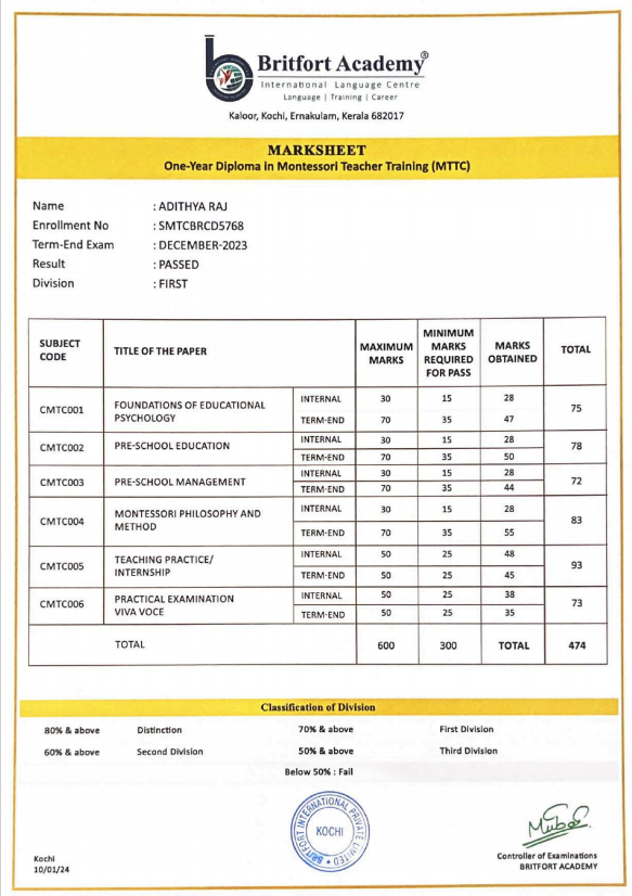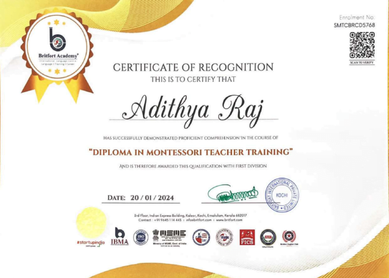 Verified ✅Issued by: Britfort AcademyIssued on: 20/01/2024Issued to: Adithya RajRegister number: SMTCBRCD5768