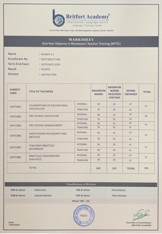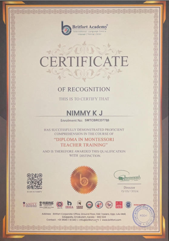 Verified ✅Issued by: Britfort AcademyIssued on: 15/05/2024Issued to: Nimmy KJRegister number: SMTCBRCD7786