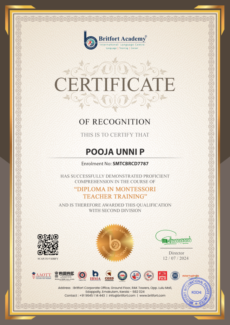Verified ✅Issued by: Britfort AcademyIssued on: 12/07/2024Issued to: Pooja Unni PRegister number: SMTCBRCD7787