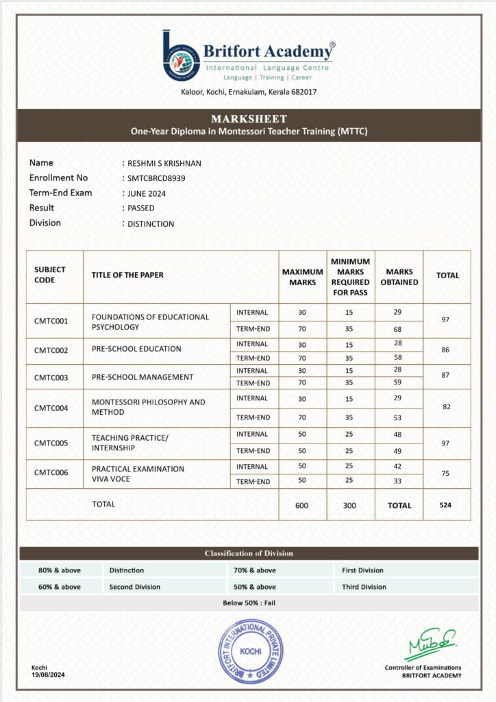 Verified ✅Issued by: Britfort AcademyIssued on: 19/08/2024Issued to: Reshmi S KrishnanRegister number: SMTCBRCD8939