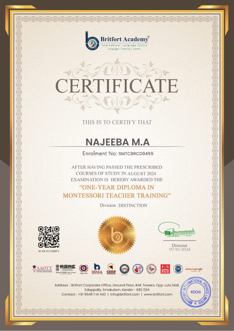 Verified ✅Issued by: Britfort AcademyIssued on: 07/10/2024Issued to: Najeeba M ARegister number: SMTCBRCD9459